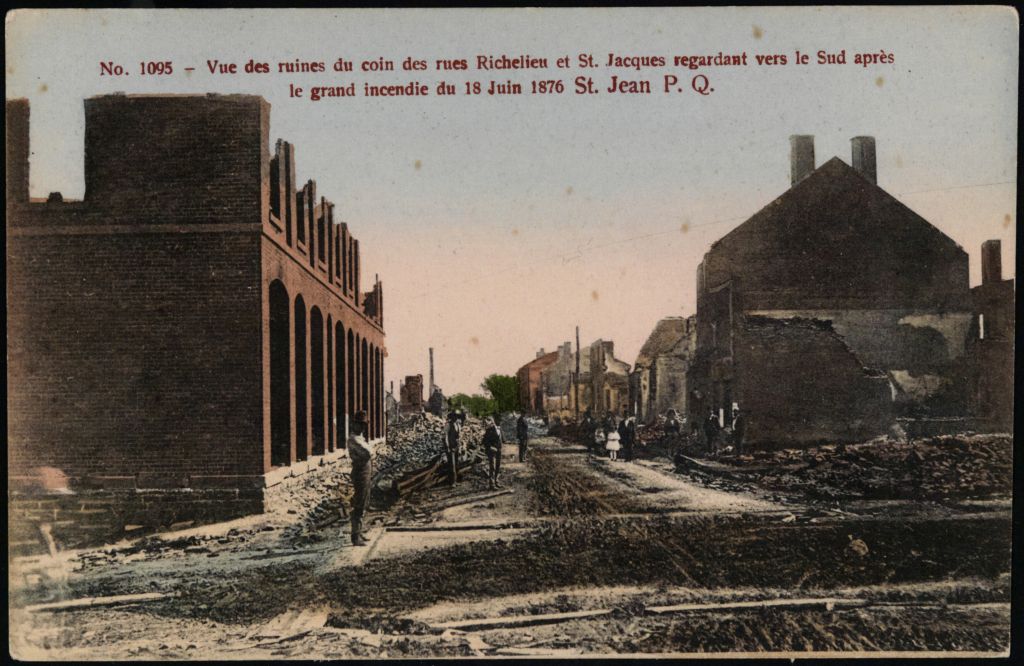 Le grand feu de 1876 qui a ravagé une partie du centre-ville de Saint-Jean (totalité de la rue Richelieu et côté est de la rue Champlain) constitue l’un des événements les plus marquants de l’histoire de notre ville. Il a profondément bouleversé le territoire, la vie quotidienne des citoyennes et citoyens et l’organisation de la communauté johannaise.